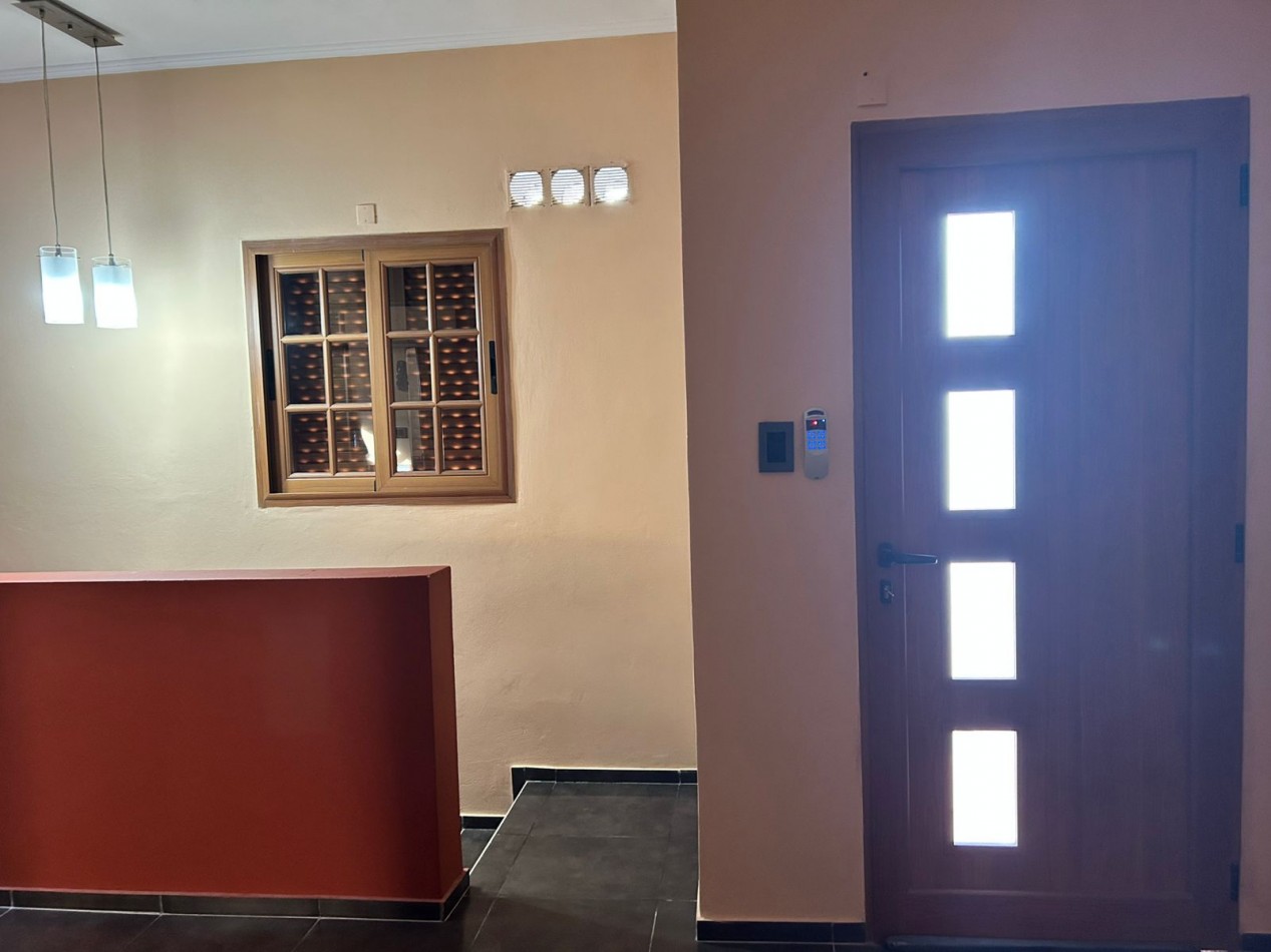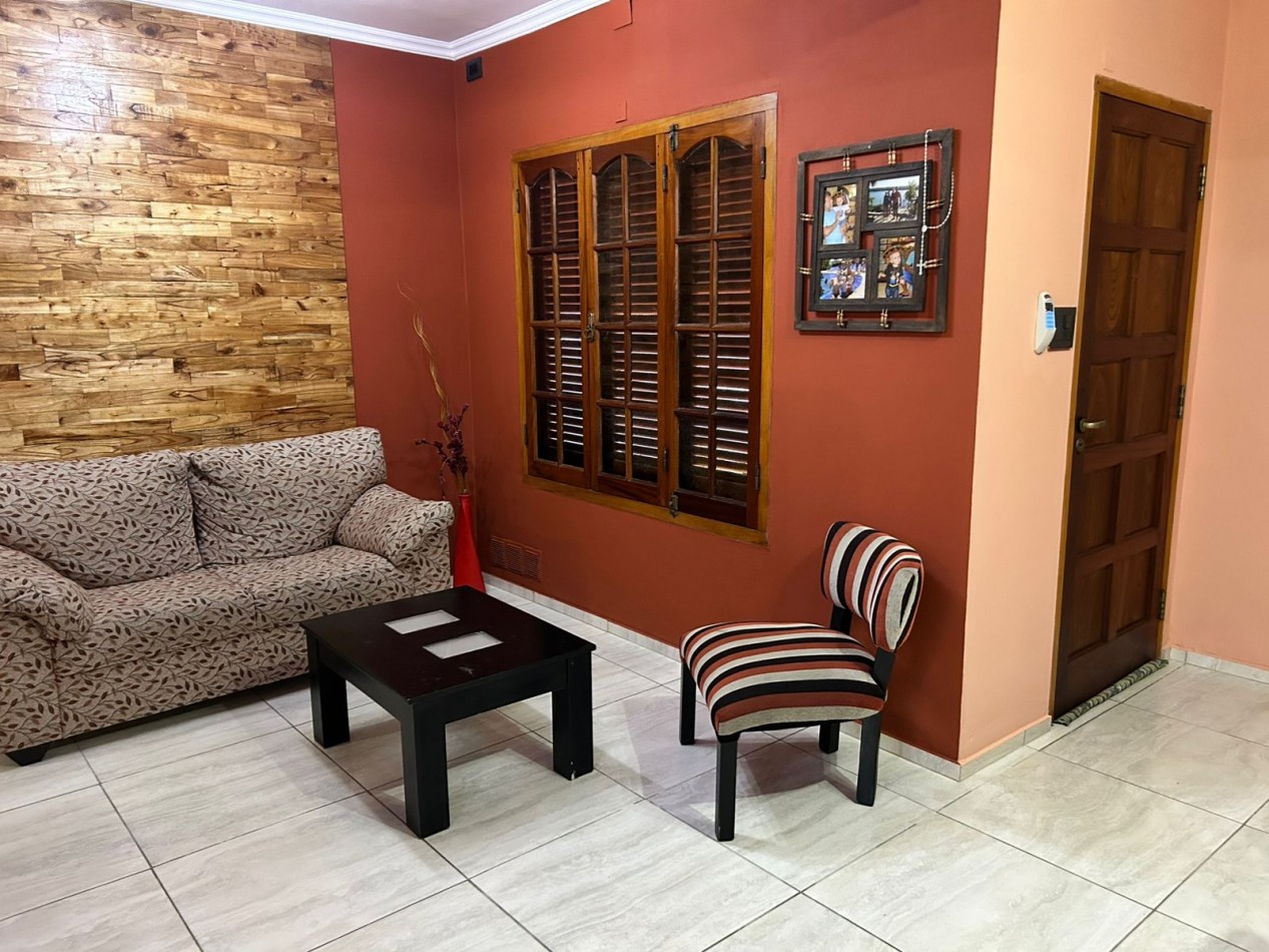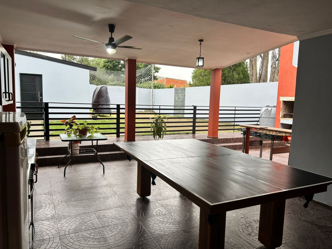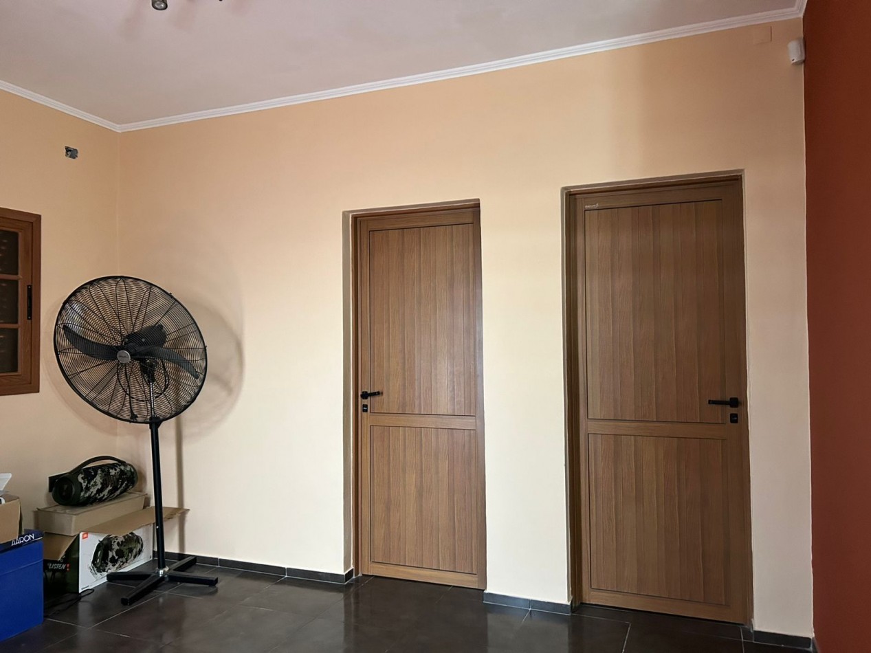 P/Baja: Porch de ingreso, amplio estar comedor diario, cocina semi integrada con amoblamientos completo de primera calidad (mesada, bajo mesada, alacena, horno, anafe, extractor) living con hogar a gas natural, 1 baño social, 1 dormitorio , garaje amplio de 3.50x7.00 gracias a sus dimensiones es muy cómodo para aperturas de puertas dentro del mismo y tener acceso directo a la vivienda, escritorio/play room, una gran galería tipo quincho con todas las comodidades y espacios para disfrutar en familia con una hermosa vista hacia el fondo parquizado con cerramientos completos brindando seguridad y privacidad, galponcito de guardado.